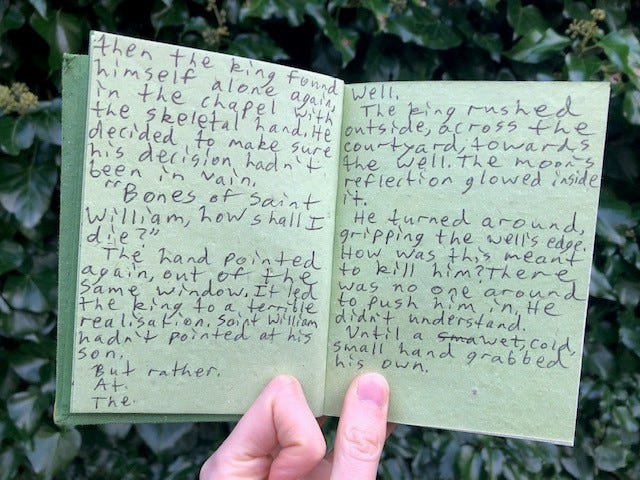Ignore the terrible writing for a moment. Ignore how it doesn’t fit in with the folktale tone. Ignore the lack of tension or build-up to the king’s just demise. Why would someone willingly rush out to the place where they’re meant to die? Even in the dream-like logic of the folktale it didn’t make much sense. Ending scrapped.